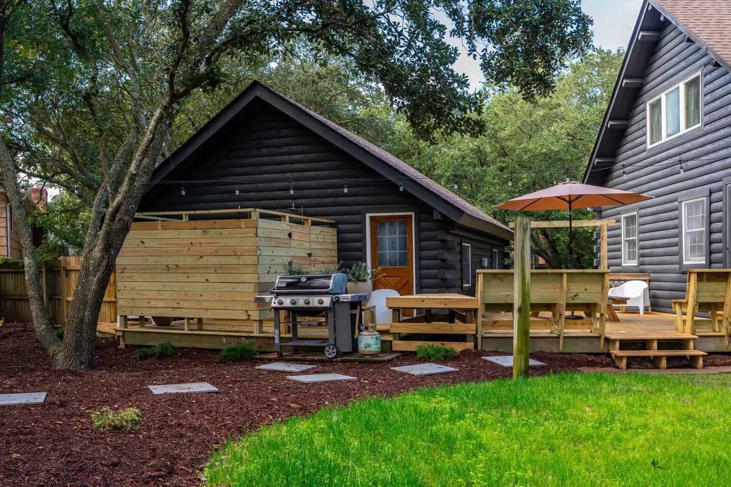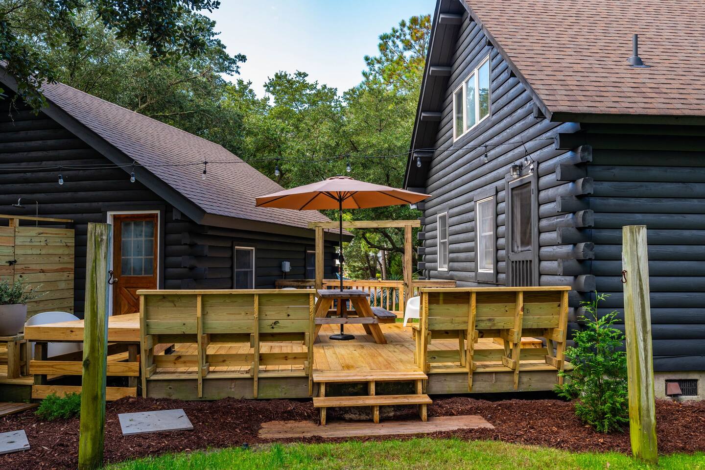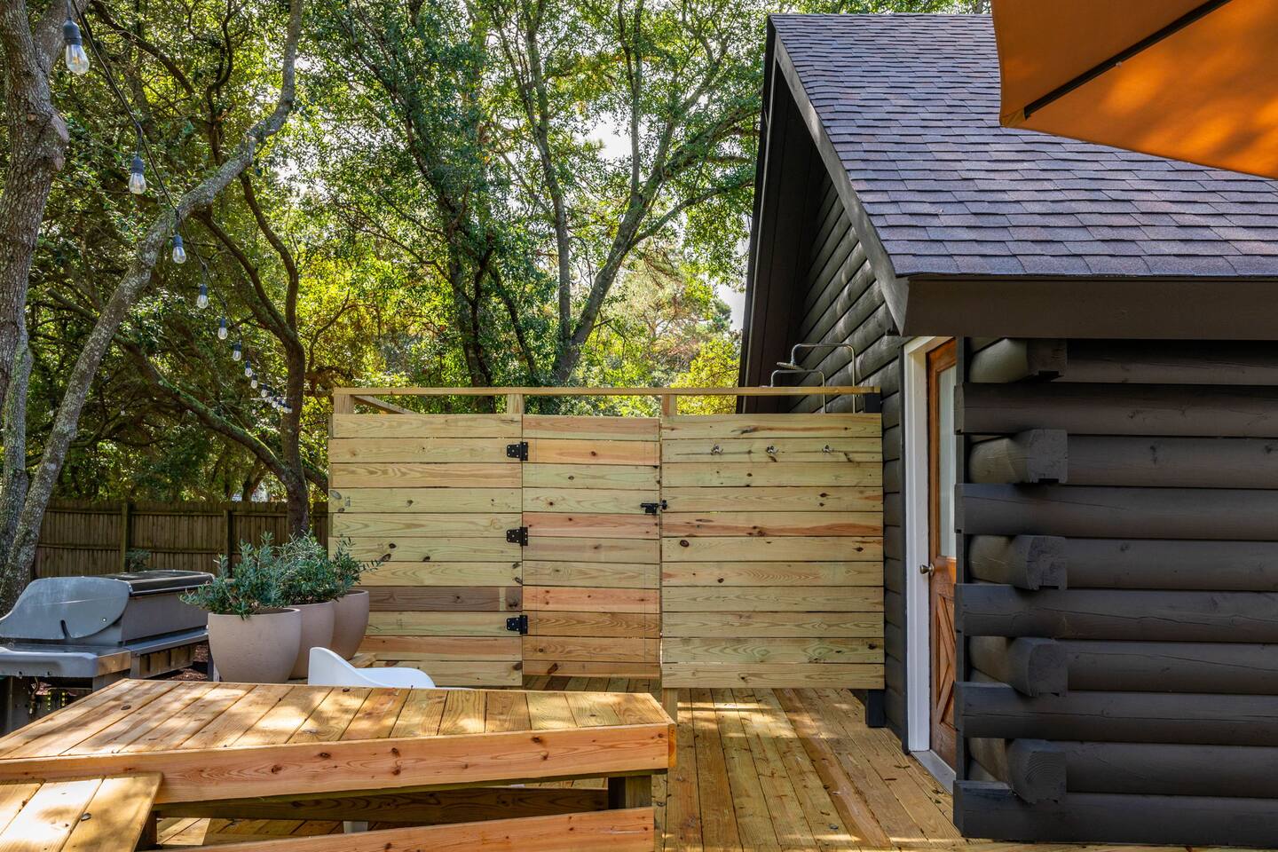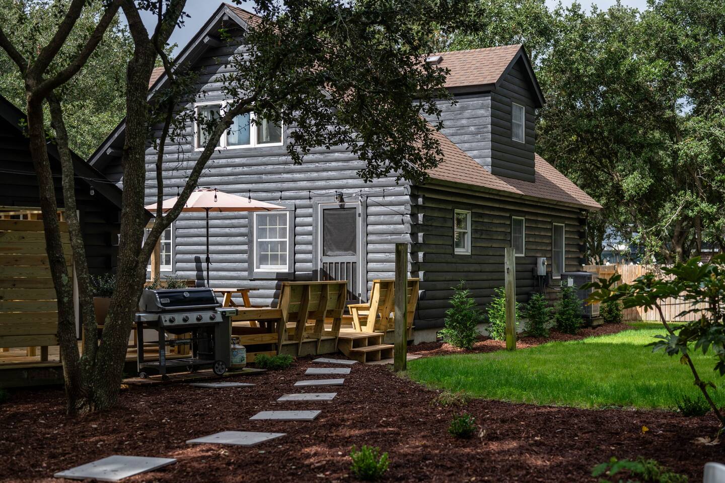 The Cabin is a unique beach cabin located in the heart of Kill Devil Hills close to the beach, bay, restaurants and attractions! The space is fully equipped with everything you need to enjoy your time in the Outer Banks! A few highlights: ✓ Short walk to to beach or to the bay ✓ Newly designed and renovated home ✓ Stunning cedar beams, logs & tongue and groove paneling ✓ Bedrooms with vaulted ceilings and exposed beams ✓ 1 Bedroom with a king sized memory foam beds & high-end duvets ✓ 2 Bedrooms, each with 2 queen sized memory foam beds & high-end duvets ✓ 2 Luxurious bathrooms clad in unique patterned tiles ✓ TV in living room equipped with Roku ✓ Amazing dual head outdoor shower with rain heads ✓ Hammock, lounge chairs and firepit ✓ Picnic table with umbrella on the deck, additional picnic tables & propane grill ✓ Bikes, beach towels, beach chairs, beach umbrellas, fire-pit, lawn games ✓ Wifi Included ✓ Free Onsite Parking Every detail was considered when designing a holiday escape for our guests. The home affords a spacious layout in a beautiful log-cabin setting. There are 3 bedrooms in the home. The primary bedroom is on the first floor with a king sized mattress. Upstairs there are two large bedrooms, each with 2 queen sized beds and a dresser/ armoire. The main living space offers a deep, comfy sofa perfect for afternoon naps as you feel the summer breezes flowing through the home. The kitchen is fully stocked and has a central island perfect for gathering around and spending time with friends and family. The kitchen is also equipped with a washer and dryer for guest use. In the dining room, you will find a large table perfect for family gatherings. The backyard is a real show stopper - perfect for all of your outdoor activities. Enjoy the sprawling lawn to layout, play games, or any other activities you can think of at the beach! Take time relaxing in the hammock or the lounge chairs during the day, or have a BBQ with the grill and picnic tables under the string lights in the evening. Finish your night by gathering around the fire pit under the stars. And finally, no matter what time of the day, the dual rain head outdoor shower is perfect for cooling off and relaxing.