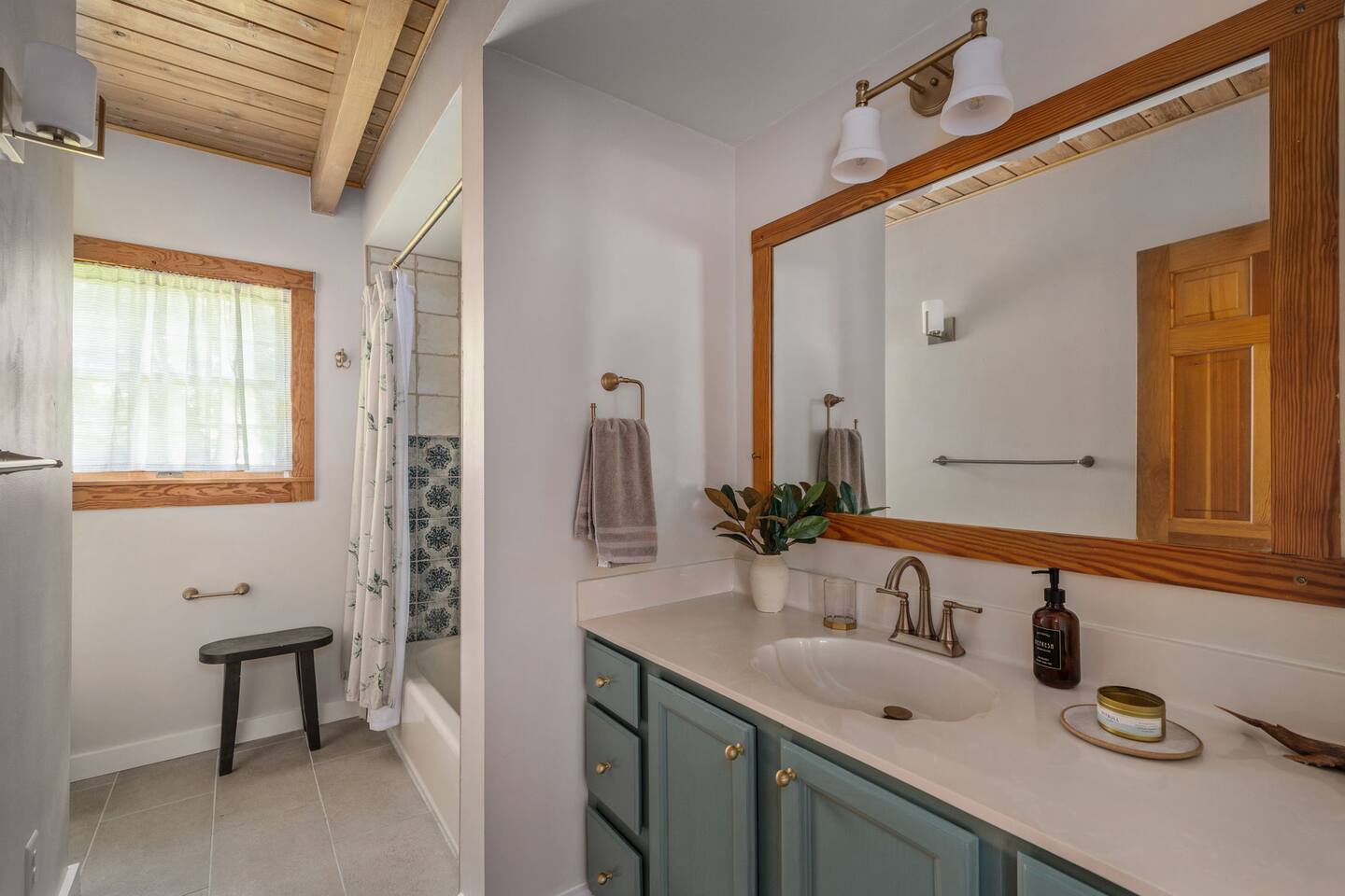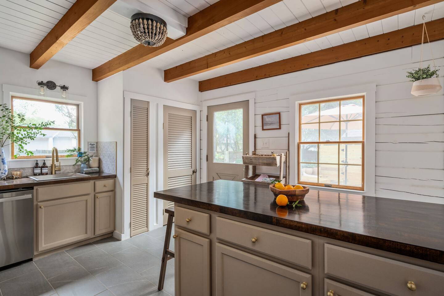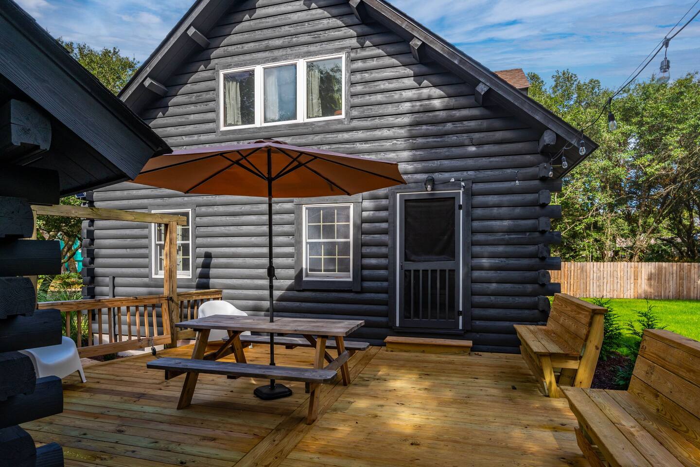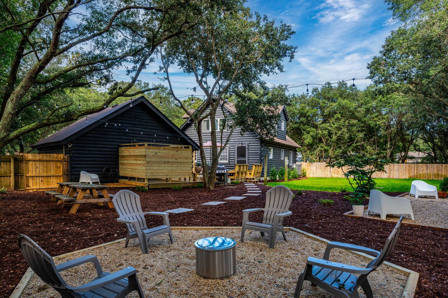 The Cabin is a unique beach cabin located in the heart of Kill Devil Hills close to the beach, bay, restaurants and attractions! The space is fully equipped with everything you need to enjoy your time in the Outer Banks! A few highlights: ✓ Short walk to to beach or to the bay ✓ Newly designed and renovated home ✓ Stunning cedar beams, logs & tongue and groove paneling ✓ Bedrooms with vaulted ceilings and exposed beams ✓ 1 Bedroom with a king sized memory foam beds & high-end duvets ✓ 2 Bedrooms, each with 2 queen sized memory foam beds & high-end duvets ✓ 2 Luxurious bathrooms clad in unique patterned tiles ✓ TV in living room equipped with Roku ✓ Amazing dual head outdoor shower with rain heads ✓ Hammock, lounge chairs and firepit ✓ Picnic table with umbrella on the deck, additional picnic tables & propane grill ✓ Bikes, beach towels, beach chairs, beach umbrellas, fire-pit, lawn games ✓ Wifi Included ✓ Free Onsite Parking Every detail was considered when designing a holiday escape for our guests. The home affords a spacious layout in a beautiful log-cabin setting. There are 3 bedrooms in the home. The primary bedroom is on the first floor with a king sized mattress. Upstairs there are two large bedrooms, each with 2 queen sized beds and a dresser/ armoire. The main living space offers a deep, comfy sofa perfect for afternoon naps as you feel the summer breezes flowing through the home. The kitchen is fully stocked and has a central island perfect for gathering around and spending time with friends and family. The kitchen is also equipped with a washer and dryer for guest use. In the dining room, you will find a large table perfect for family gatherings. The backyard is a real show stopper - perfect for all of your outdoor activities. Enjoy the sprawling lawn to layout, play games, or any other activities you can think of at the beach! Take time relaxing in the hammock or the lounge chairs during the day, or have a BBQ with the grill and picnic tables under the string lights in the evening. Finish your night by gathering around the fire pit under the stars. And finally, no matter what time of the day, the dual rain head outdoor shower is perfect for cooling off and relaxing.