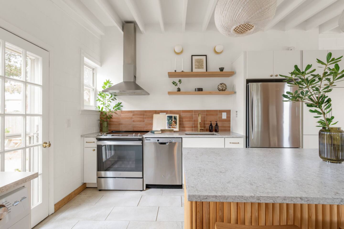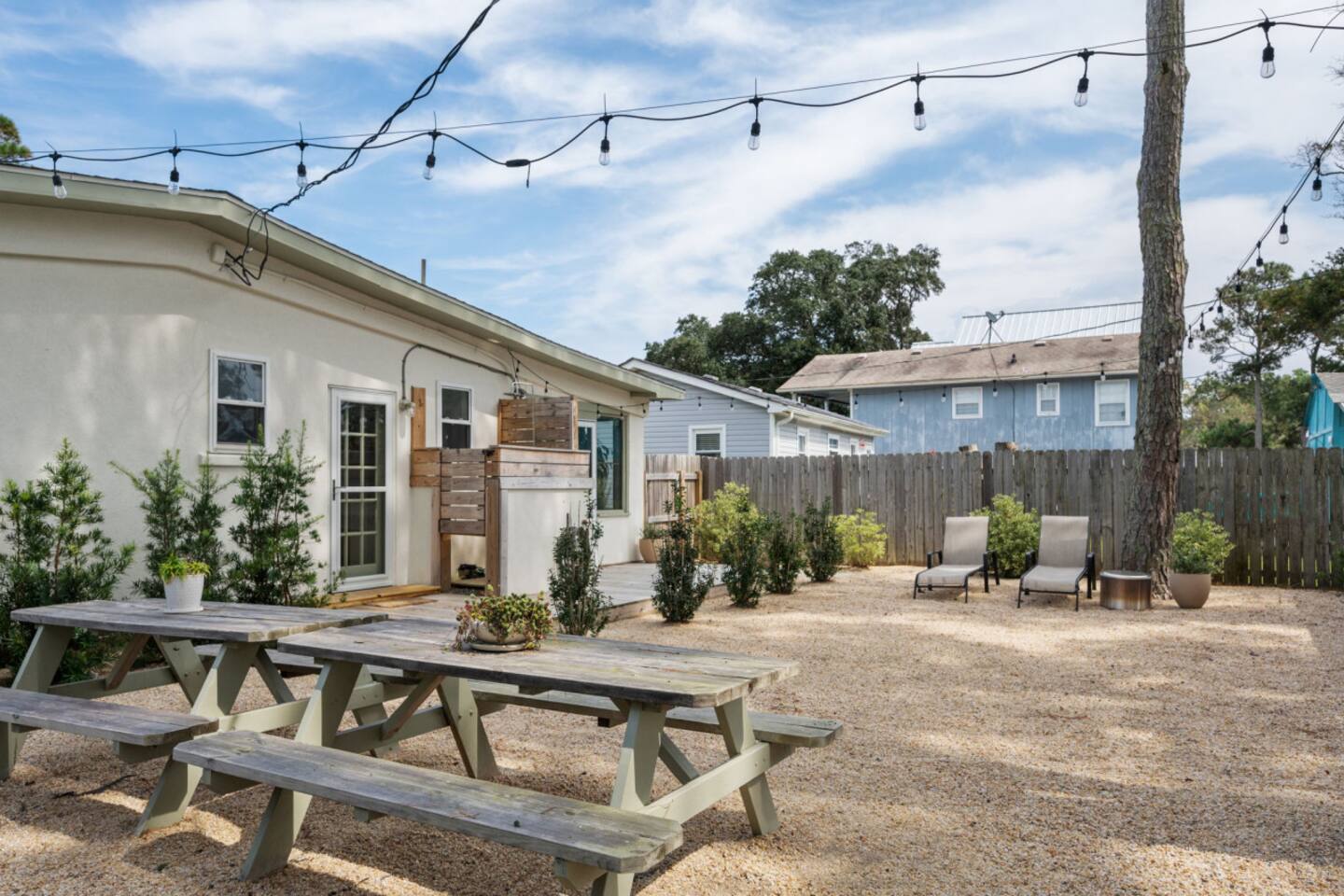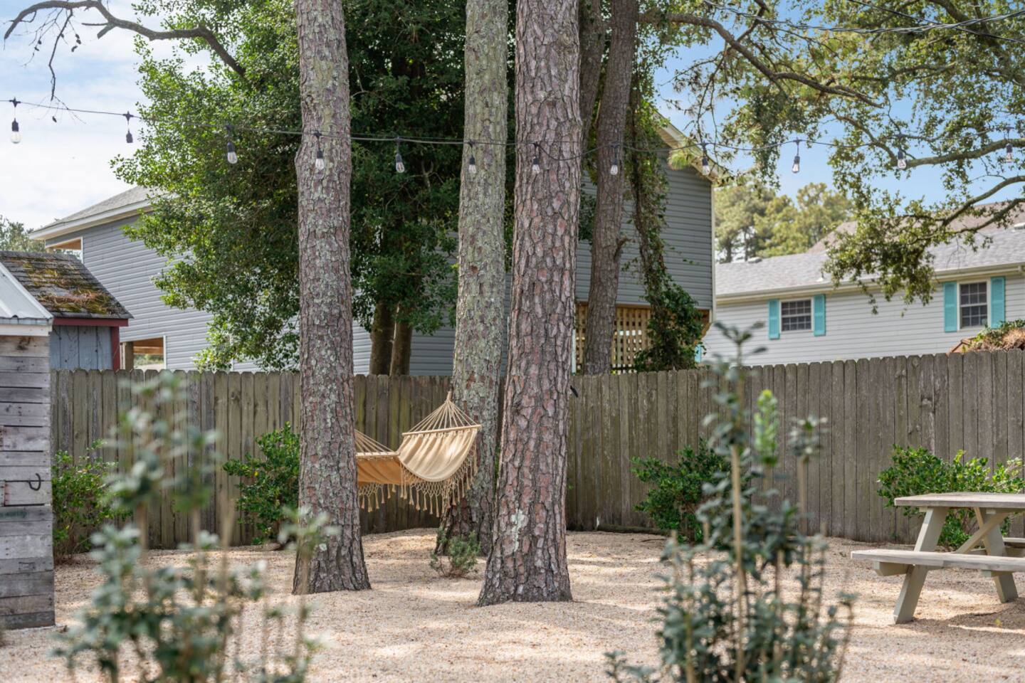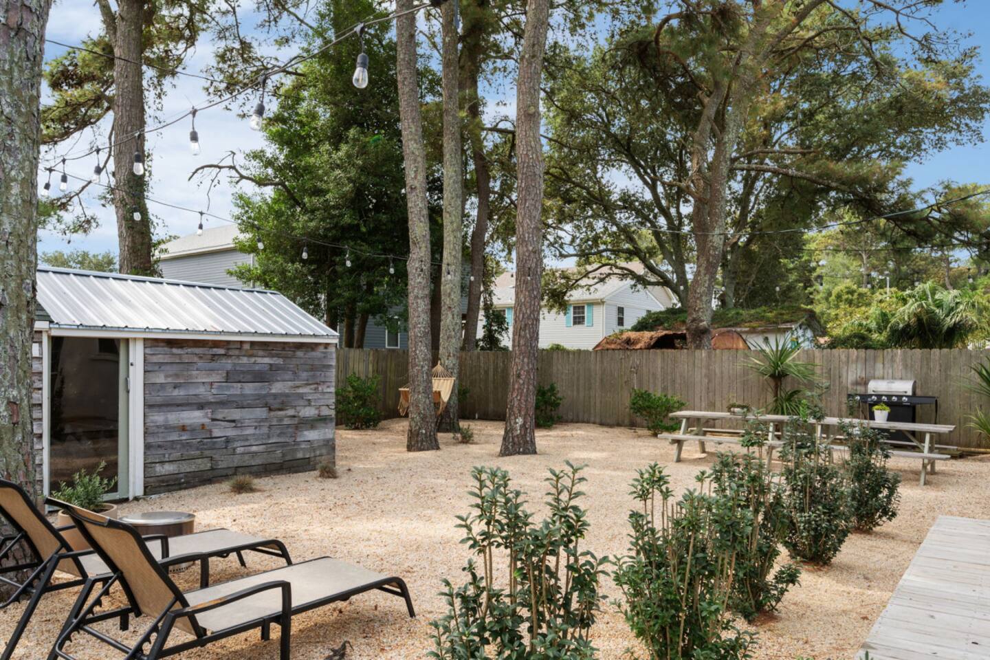 The Casita is a quintessential beach bungalow located in the heart of Kill Devil Hills close to the beach, bay, restaurants and attractions! The space is fully equipped with everything you need to enjoy your time in the Outer Banks! A few highlights: ✓ Short walk to to beach or to the bay ✓ Newly designed and renovated home ✓ Fluted cypress island and concrete finish quartz countertops ✓ Vaulted ceilings with exposed beams ✓ 2 bedrooms with queen size memory foam beds & high-end duvets ✓ Luxurious bathroom clad in terracotta accents ✓ TVs in living room and both bedrooms with Amazon Firesticks ✓ Amazing outdoor shower with rain head ✓ Hammock & Lounge chairs ✓ Picnic table & propane grill ✓ Bikes, beach towels, beach umbrellas, fire-pit, paddle board ✓ Wifi Included ✓ Free Onsite Parking Every detail was considered when designing a holiday escape for our guests. The home affords an open concept living & kitchen space, 2 bedrooms with queen sized beds & 1 luxurious bathroom. There are 2 bedrooms in the home, both with queen sized beds and a dresser/ armoire, as well as a TV equipped with Amazon Firesticks. The main living space offers a deep, comfy sofa perfect for afternoon naps as you feel the summer breezes flowing through the home. The kitchen is fully stocked and has a central island perfect for gathering around and spending time with friends and family. The kitchen is also equipped with a washer and dryer for guest use. The backyard is perfect for all of your outdoor activities. Enjoy relaxing in the hammock or the lounge chairs during the day, or have a BBQ with the grill and picnic table under the string lights in the evening. Finish your night by gathering around the fire pit under the stars. And finally, no matter what time of the day, the rain head outdoor shower is perfect for cooling off and relaxing.