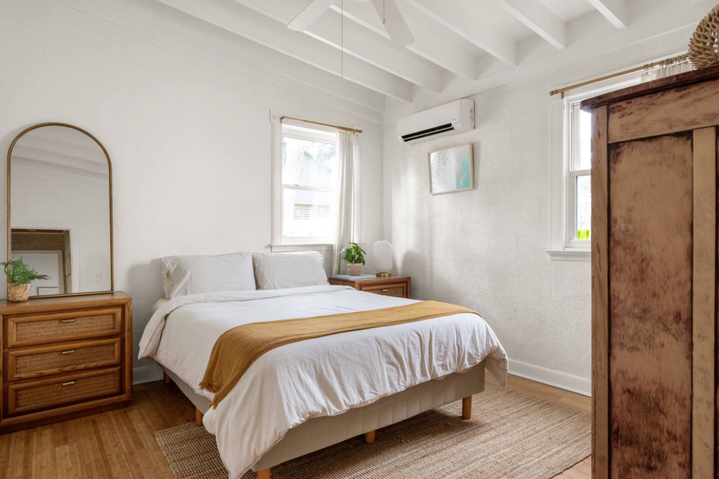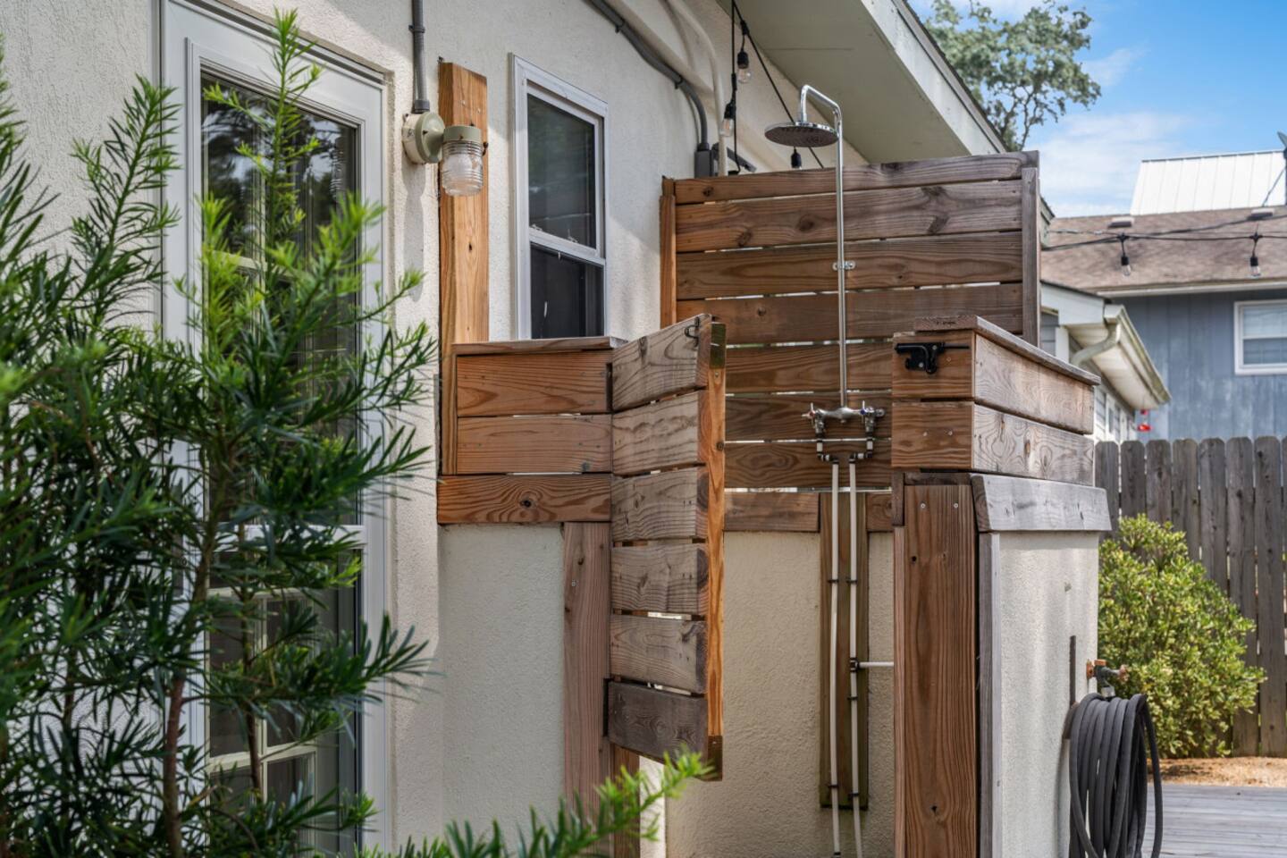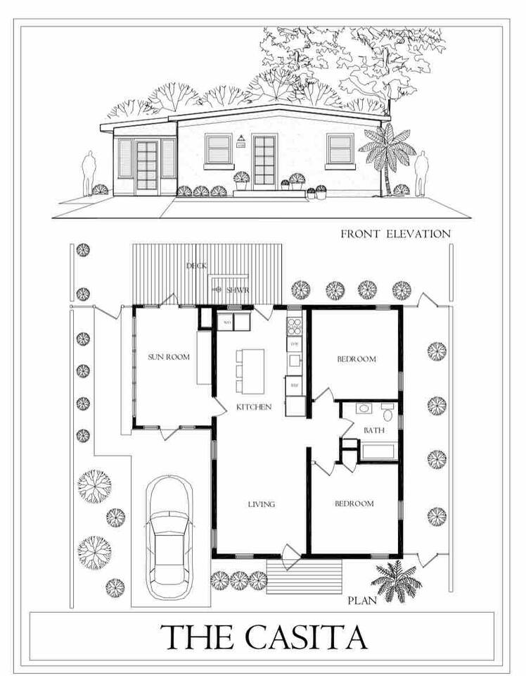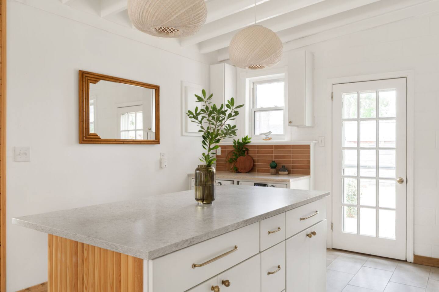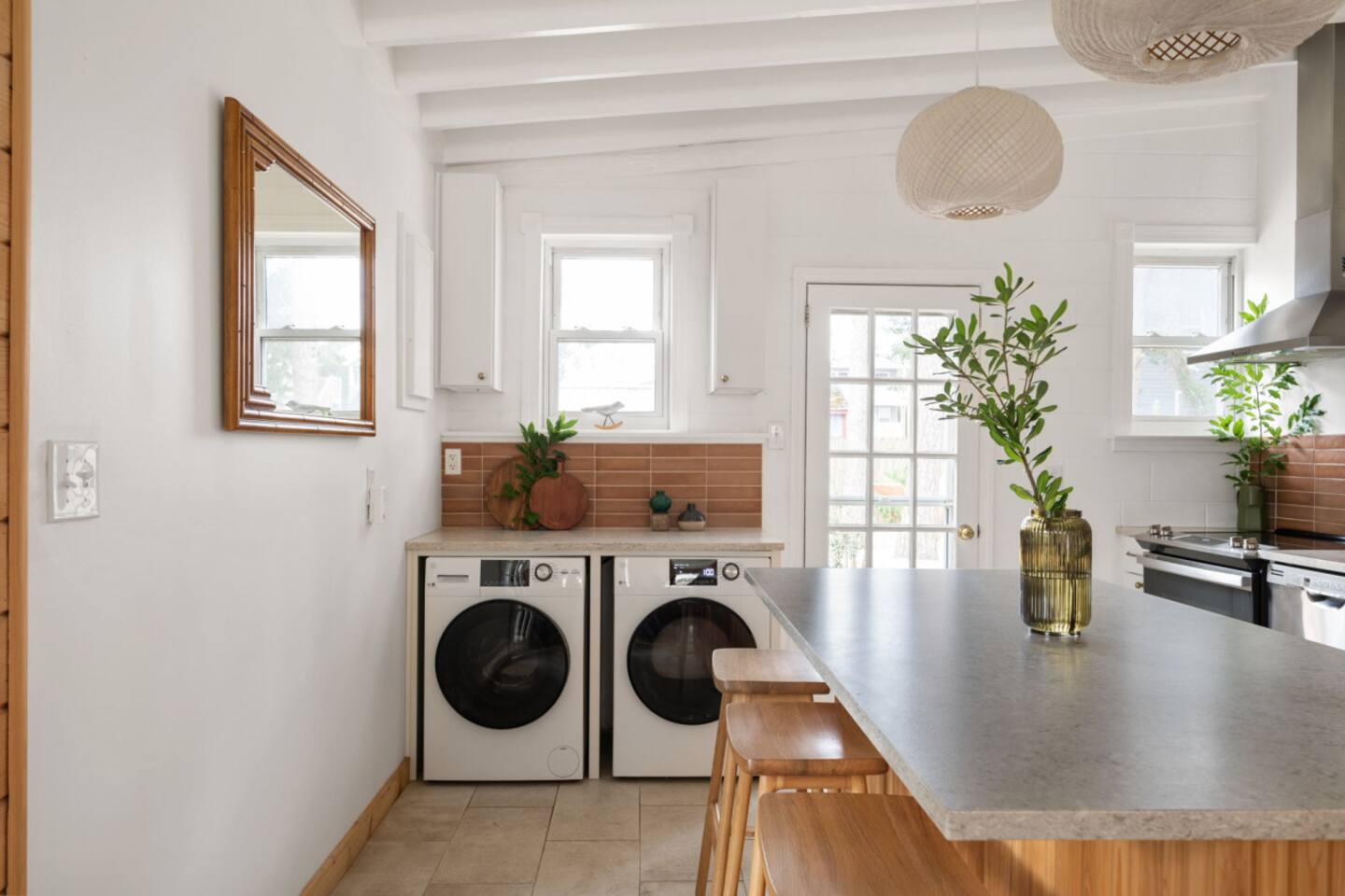 The Casita is a quintessential beach bungalow located in the heart of Kill Devil Hills close to the beach, bay, restaurants and attractions! The space is fully equipped with everything you need to enjoy your time in the Outer Banks! A few highlights: ✓ Short walk to to beach or to the bay ✓ Newly designed and renovated home ✓ Fluted cypress island and concrete finish quartz countertops ✓ Vaulted ceilings with exposed beams ✓ 2 bedrooms with queen size memory foam beds & high-end duvets ✓ Luxurious bathroom clad in terracotta accents ✓ TVs in living room and both bedrooms with Amazon Firesticks ✓ Amazing outdoor shower with rain head ✓ Hammock & Lounge chairs ✓ Picnic table & propane grill ✓ Bikes, beach towels, beach umbrellas, fire-pit, paddle board ✓ Wifi Included ✓ Free Onsite Parking Every detail was considered when designing a holiday escape for our guests. The home affords an open concept living & kitchen space, 2 bedrooms with queen sized beds & 1 luxurious bathroom. There are 2 bedrooms in the home, both with queen sized beds and a dresser/ armoire, as well as a TV equipped with Amazon Firesticks. The main living space offers a deep, comfy sofa perfect for afternoon naps as you feel the summer breezes flowing through the home. The kitchen is fully stocked and has a central island perfect for gathering around and spending time with friends and family. The kitchen is also equipped with a washer and dryer for guest use. The backyard is perfect for all of your outdoor activities. Enjoy relaxing in the hammock or the lounge chairs during the day, or have a BBQ with the grill and picnic table under the string lights in the evening. Finish your night by gathering around the fire pit under the stars. And finally, no matter what time of the day, the rain head outdoor shower is perfect for cooling off and relaxing.